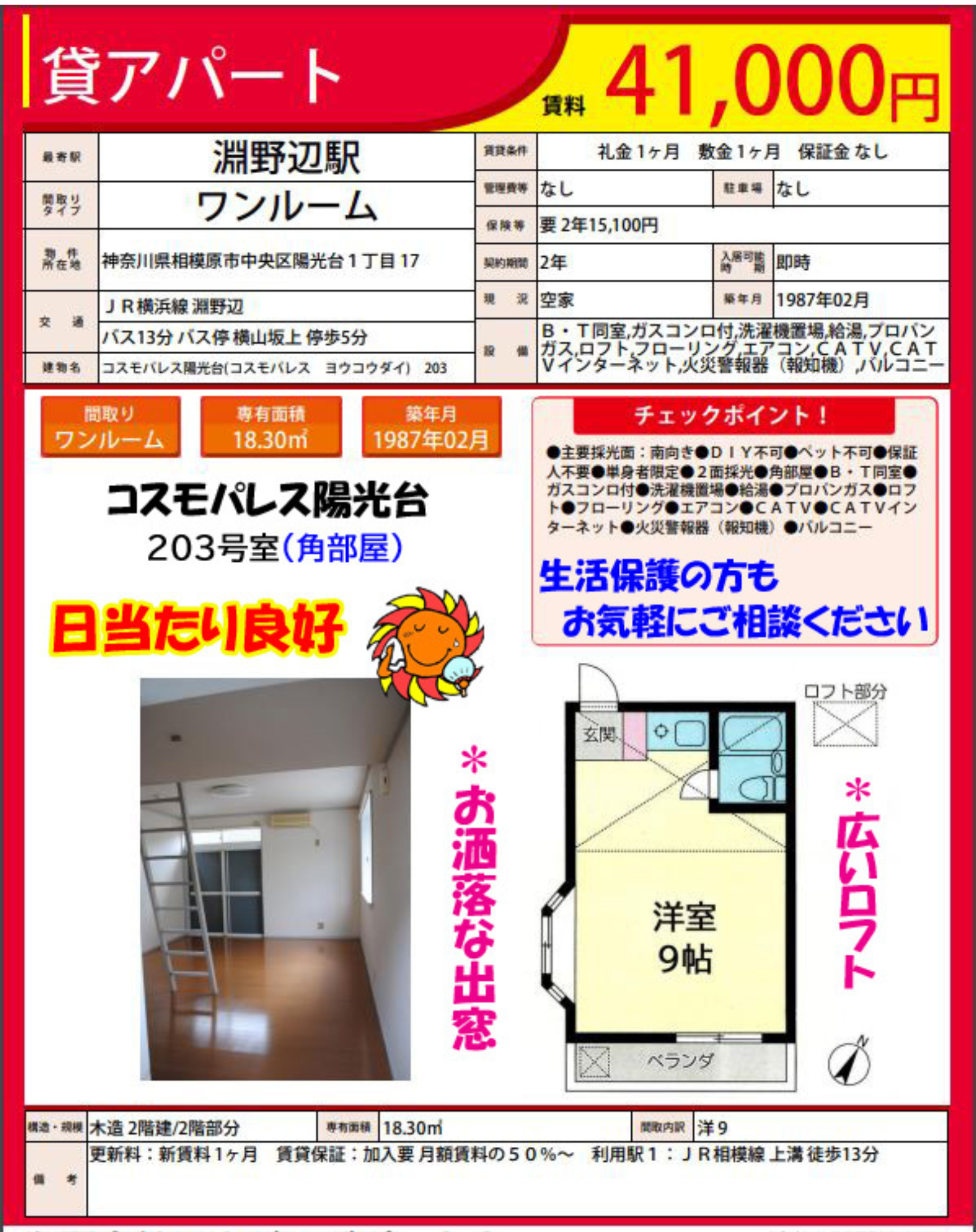 ・人気の広いロフト付き物件♪ ・南向き♪日当たり良好!!角部屋☆ ・エアコン/CATV ・上溝からも徒歩13分 |